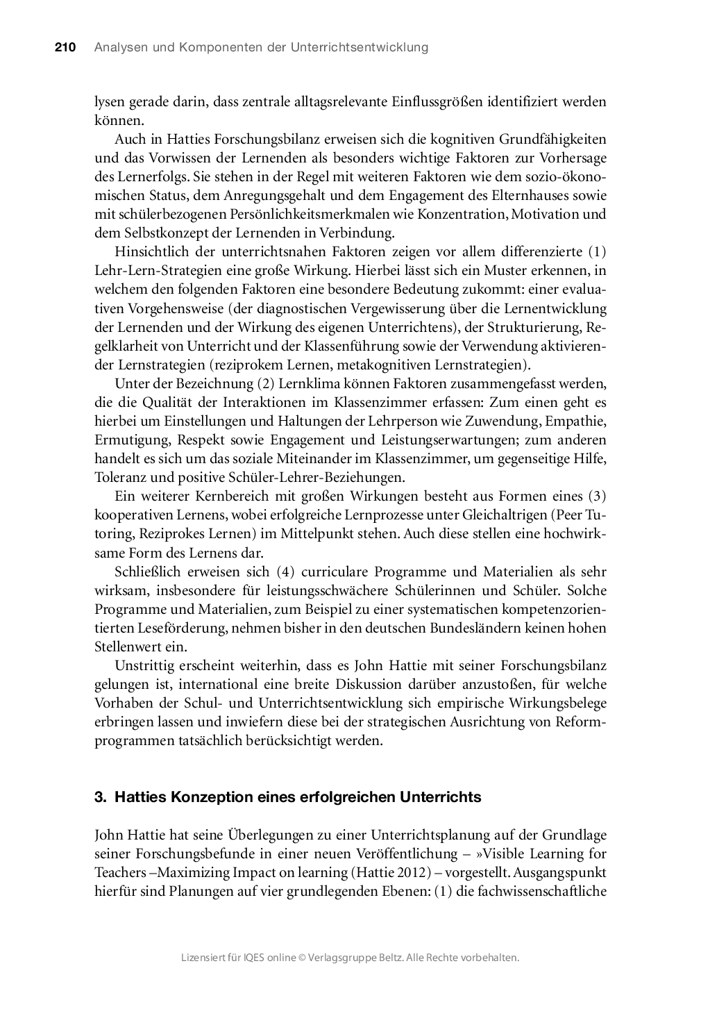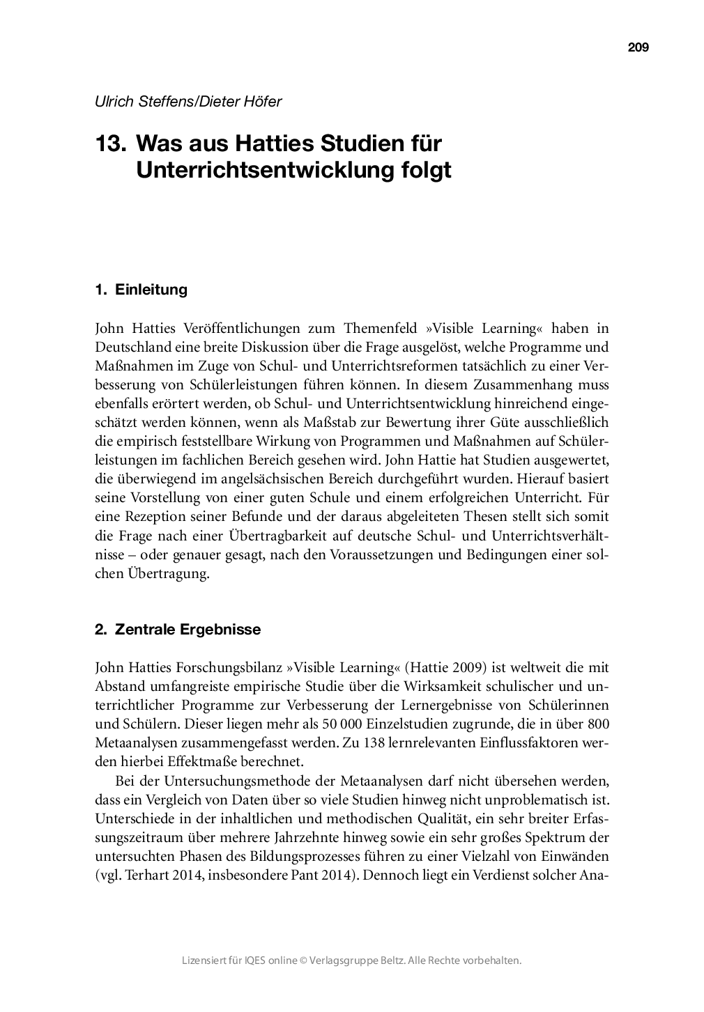John Hatties Veröffentlichungen zum Themenfeld »Visible Learning« haben in Deutschland eine breite Diskussion über die Frage ausgelöst, welche Programme und Maßnahmen im Zuge von Schul- und Unterrichtsreformen tatsächlich zu einer Verbesserung von Schülerleistungen führen können. In diesem Zusammenhang muss ebenfalls erörtert werden, ob Schul- und Unterrichtsentwicklung hinreichend eingeschätzt werden können, wenn als Maßstab zur Bewertung ihrer Güte ausschließlich die empirisch feststellbare Wirkung von Programmen und Maßnahmen auf Schülerleistungen im fachlichen Bereich gesehen wird.