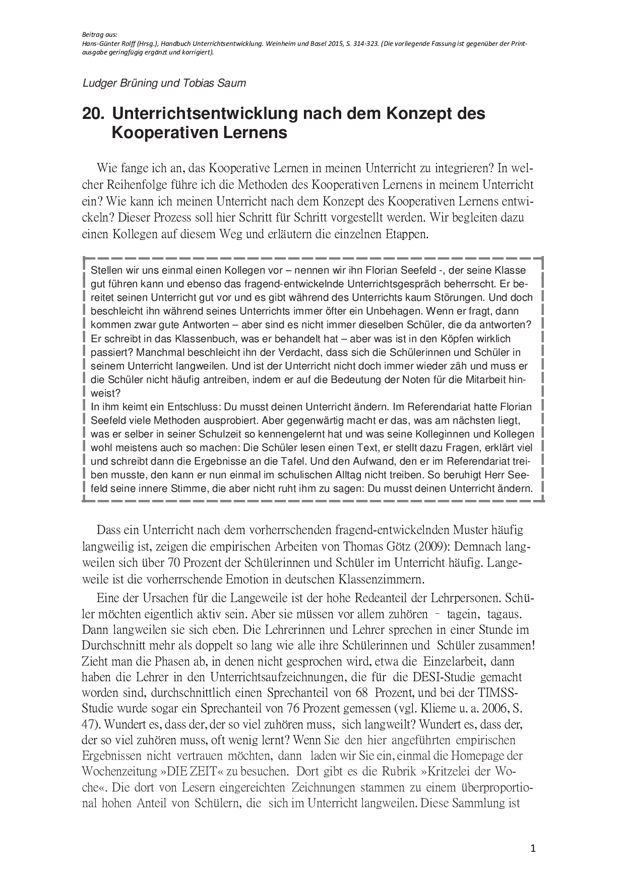 Unterrichtsentwicklung nach dem Konzept des Kooperativen Lernens