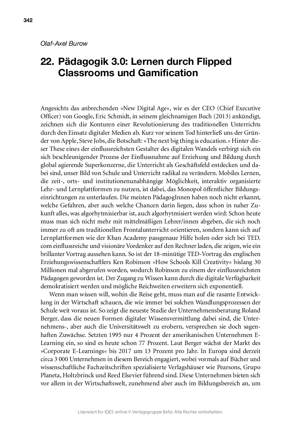 Angesichts das anbrechenden »New Digital Age«, wie es der CEO (Chief Executive Officer) von Google, Eric Schmidt, in seinem gleichnamigen Buch (2013) ankündigt, zeichnen sich die Konturen einer Revolutionierung des traditionellen Unterrichts durch den Einsatz digitaler Medien ab. Kurz vor seinem Tod hinterließ uns der Gründer von Apple, Steve Jobs, die Botschaft: »The next big thing is education.« Hinter dieser These eines der einflussreichsten Gestalter des digitalen Wandels verbirgt sich ein sich beschleunigender Prozess der Einflussnahme auf Erziehung und Bildung durch global agierende Superkonzerne, die Unterricht als Geschäftsfeld entdecken und dabei sind, unser Bild von Schule und Unterricht radikal zu verändern. Mobiles Lernen, die zeit-, orts- und institutionenunabhängige Möglichkeit, interaktiv organisierte Lehr- und Lernplattformen zu nutzen, ist dabei, das Monopol öffentlicher Bildungseinrichtungen zu unterlaufen.