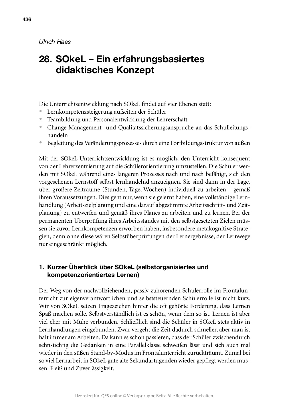 Mit der SOkeL-Unterrichtsentwicklung ist es möglich, den Unterricht konsequent von der Lehrerzentrierung auf die Schülerorientierung umzustellen. In diesem Beitrag wird erklärt, welche Vorteile dieses Konzept mit sich bringt und wie es im Unterricht umgesetzt werden kann.Die Unterrichtsentwicklung nach SOkeL findet auf vier Ebenen statt: - Lernkompetenzsteigerung aufseiten der Schüler - Teambildung und Personalentwicklung der Lehrerschaft - Change Management- und Qualitätssicherungsansprüche an das Schulleitungshandeln - Begleitung des Veränderungsprozesses durch eine Fortbildungsstruktur von außen