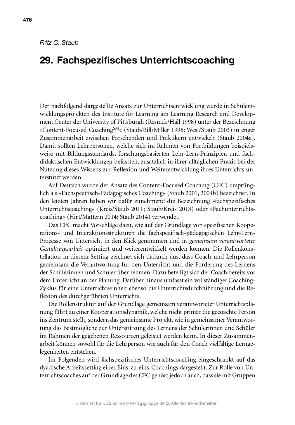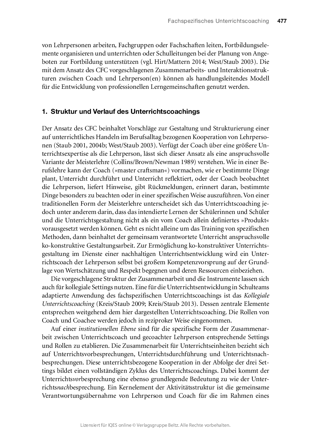 Der nachfolgend dargestellte Ansatz zur Unterrichtsentwicklung wurde in Schulentwicklungsprojekten des Institute for Learning am Learning Research and Development Center der University of Pittsburgh (Resnick/Hall 1998) unter der Bezeichnung »Content-Focused Coaching SM« (Staub/Bill/Miller 1998; West/Staub 2003) in enger Zusammenarbeit zwischen Forschenden und Praktikern entwickelt (Staub 2004a). Damit sollten Lehrpersonen, welche sich im Rahmen von Fortbildungen beispielsweise mit Bildungsstandards, forschungsbasierten Lehr-Lern-Prinzipien und fachdidaktischen Entwicklungen befassten, zusätzlich in ihrer alltäglichen Praxis bei der Nutzung dieses Wissens zur Reflexion und Weiterentwicklung ihres Unterrichts unterstützt werden.