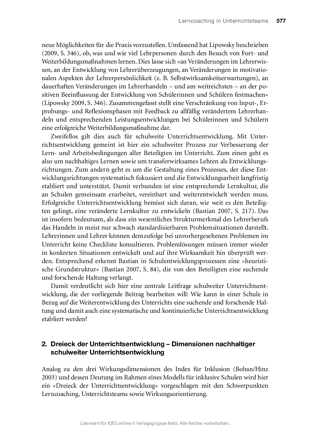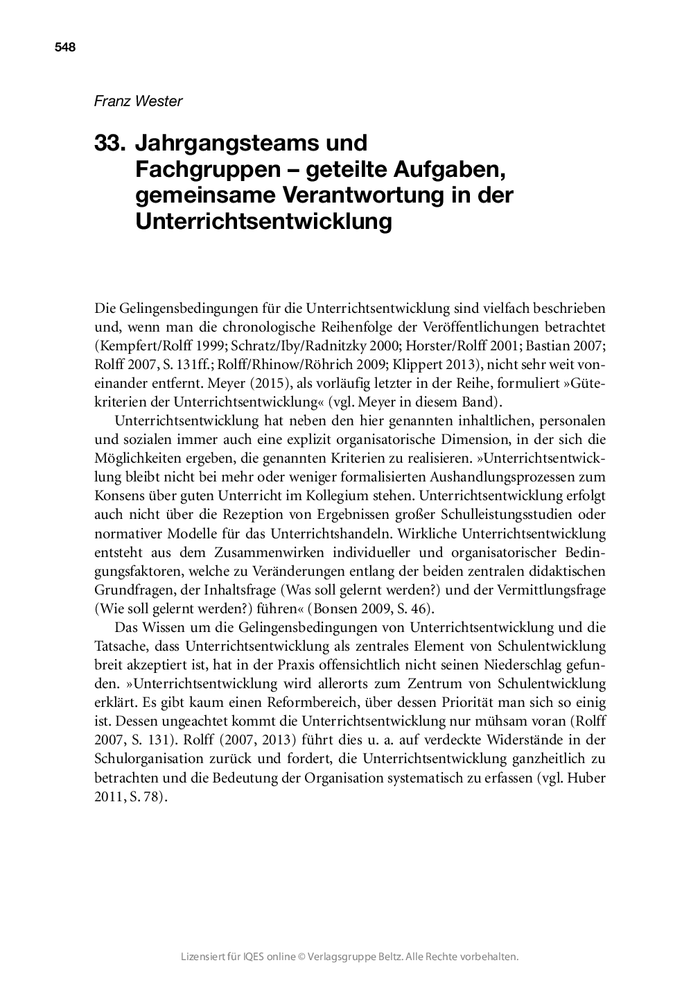 Die Gelingensbedingungen für die Unterrichtsentwicklung sind vielfach beschrieben und, wenn man die chronologische Reihenfolge der Veröffentlichungen betrachtet (Kempfert/Rolff 1999; Schratz/Iby/Radnitzky 2000; Horster/Rolff 2001; Bastian 2007; Rolff 2007, S. 131ff.; Rolff/Rhinow/Röhrich 2009; Klippert 2013), nicht sehr weit voneinander entfernt. Meyer (2015), als vorläufig letzter in der Reihe, formuliert »Gütekriterien der Unterrichtsentwicklung« (vgl. Meyer in diesem Band).