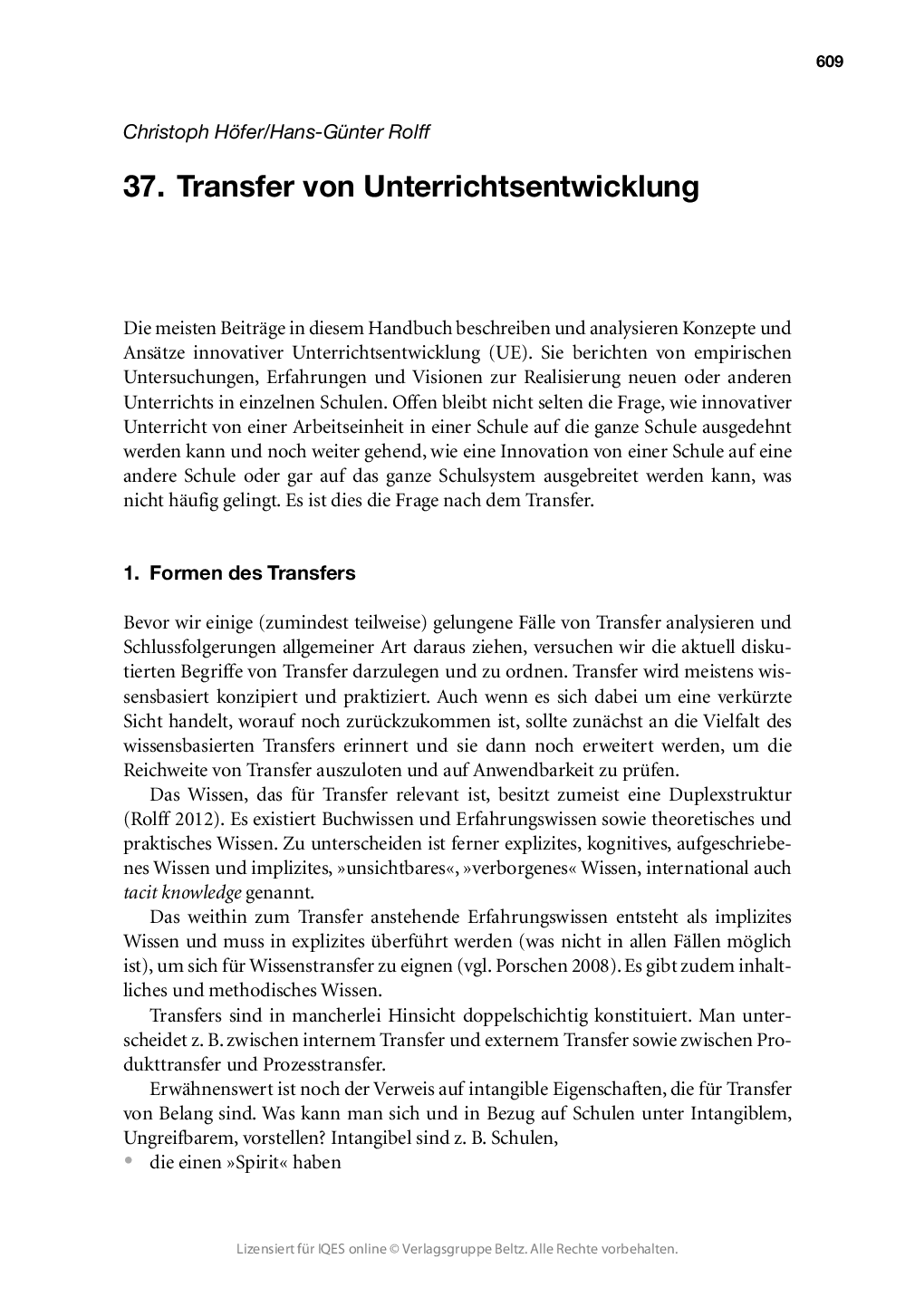 Die meisten Beiträge in diesem Handbuch beschreiben und analysieren Konzepte und Ansätze innovativer Unterrichtsentwicklung (UE). Sie berichten von empirischen Untersuchungen, Erfahrungen und Visionen zur Realisierung neuen oder anderen Unterrichts in einzelnen Schulen. Offen bleibt nicht selten die Frage, wie innovativer Unterricht von einer Arbeitseinheit in einer Schule auf die ganze Schule ausgedehnt werden kann und noch weiter gehend, wie eine Innovation von einer Schule auf eine andere Schule oder gar auf das ganze Schulsystem ausgebreitet werden kann, was nicht häufig gelingt. Es ist dies die Frage nach dem Transfer.