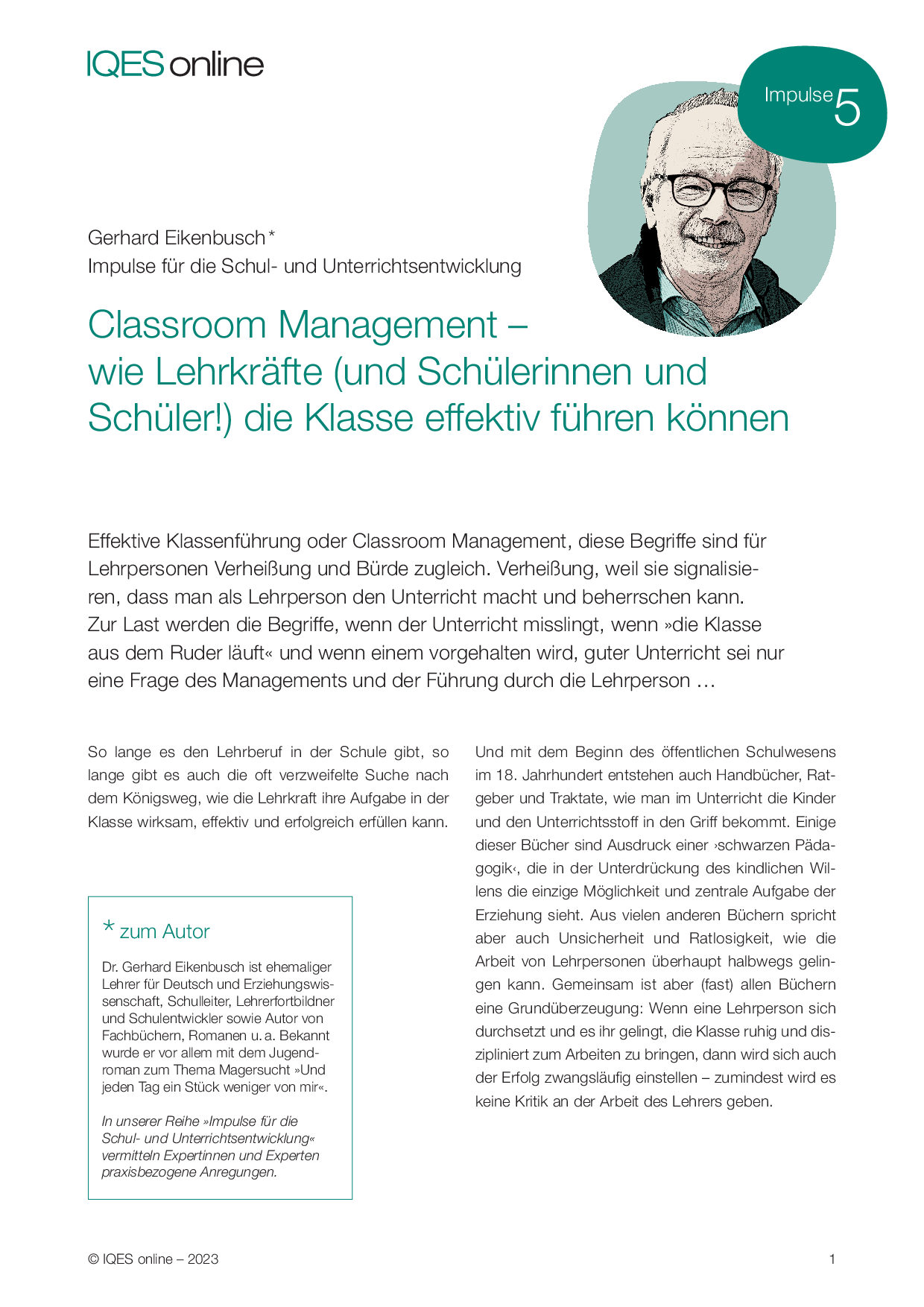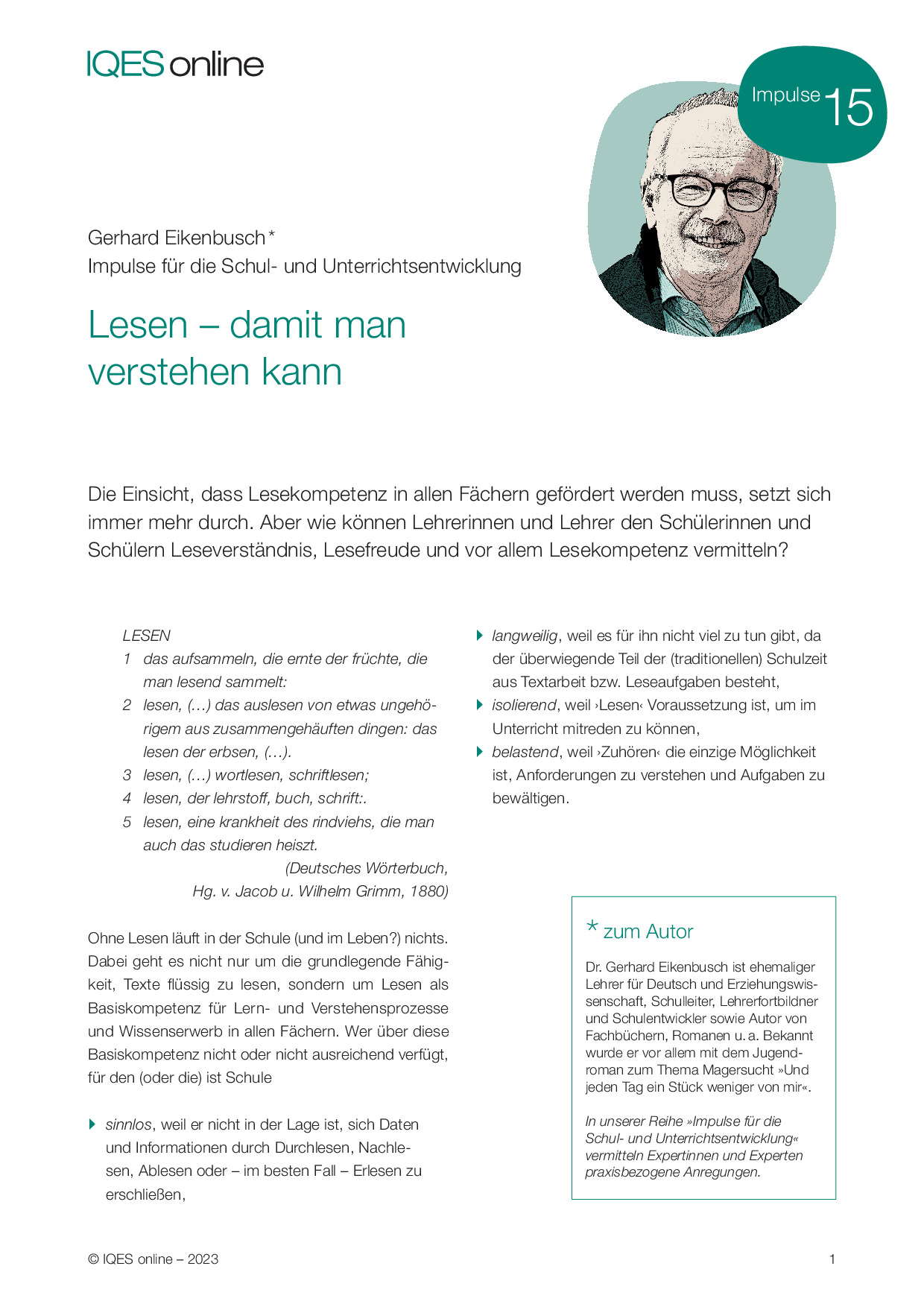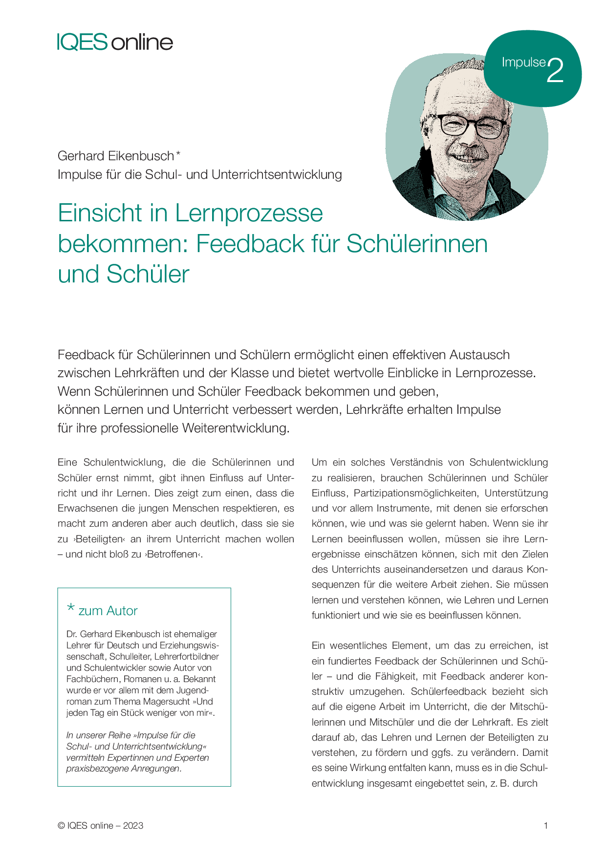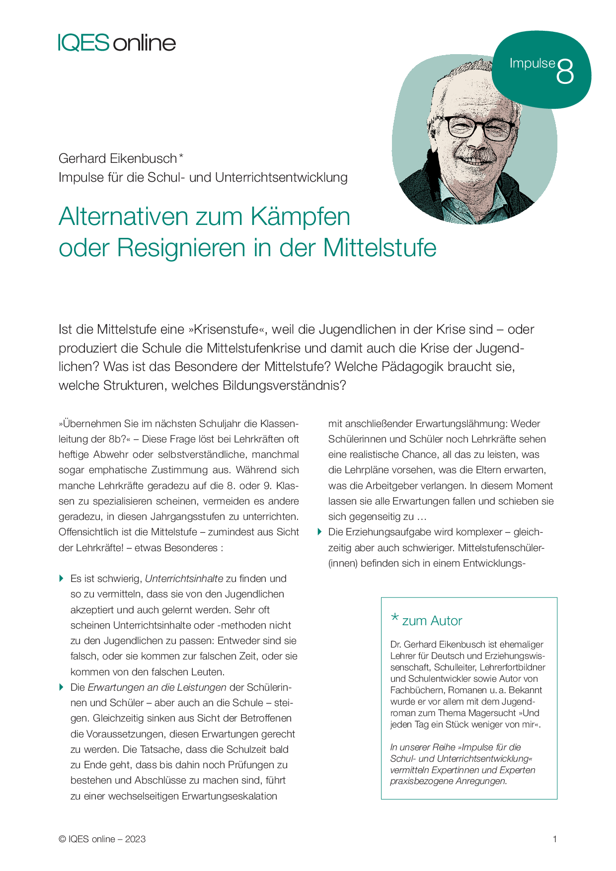 Zum Autor: Dr. Gerhard Eikenbusch ist ehemaliger Lehrer für Deutsch und Erziehungswissenschaft, Schulleiter, Lehrerfortbildner und Schulentwickler sowie Autor von Fachbüchern, Romanen u. a. Bekannt wurde er vor allem mit dem Jugendroman zum Thema Magersucht »Und jeden Tag ein Stück weniger von mir«.