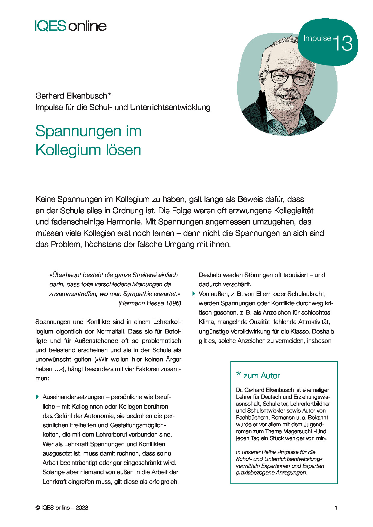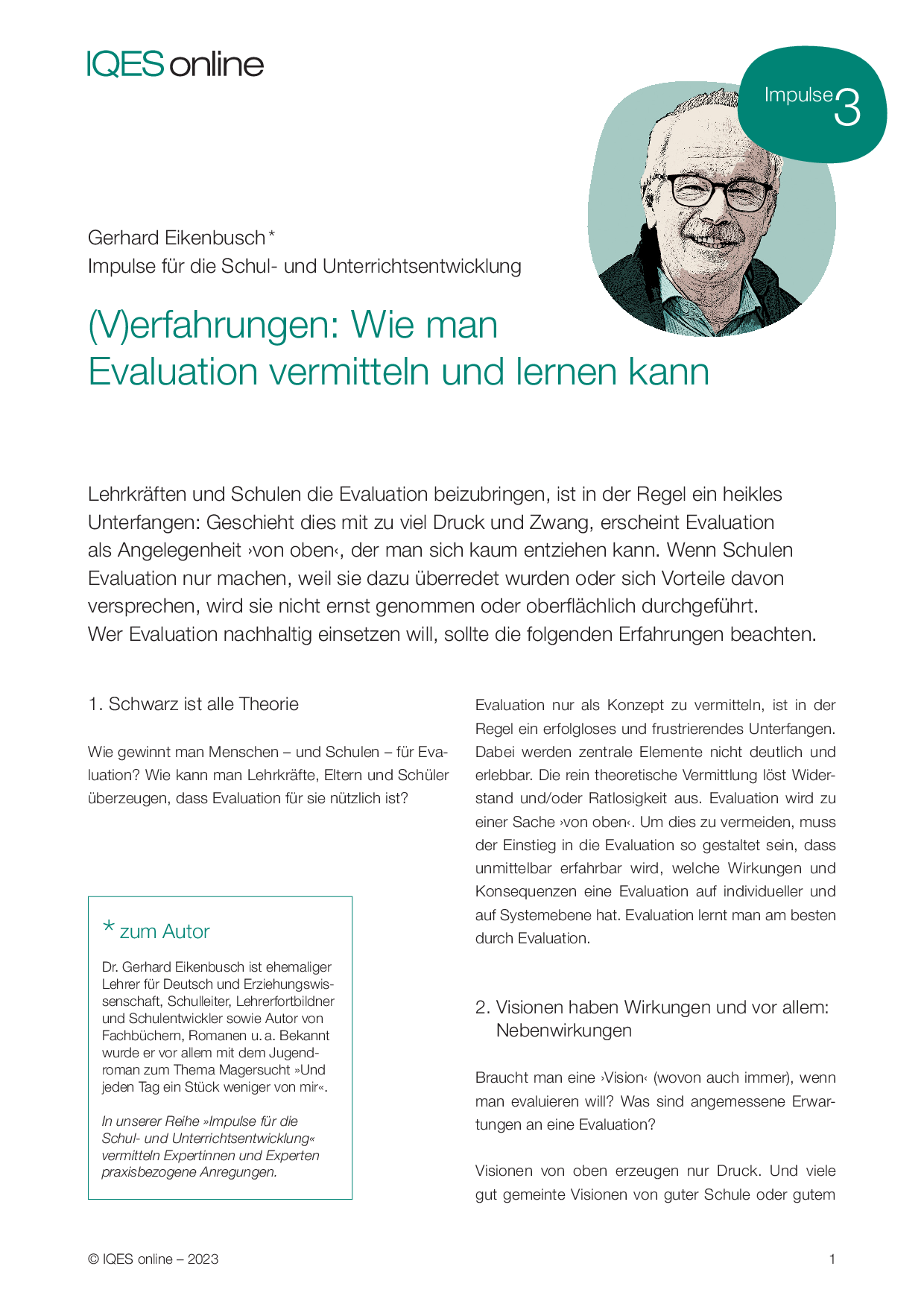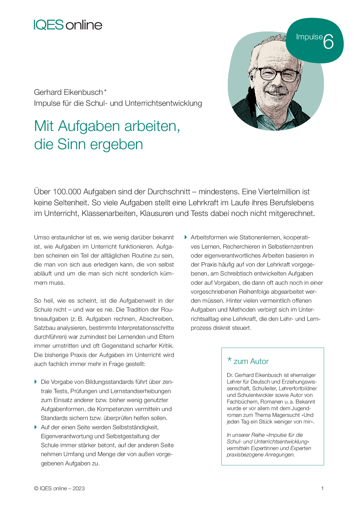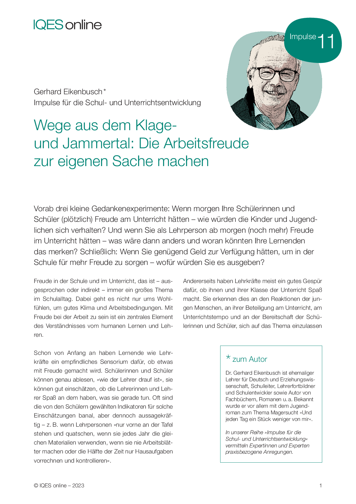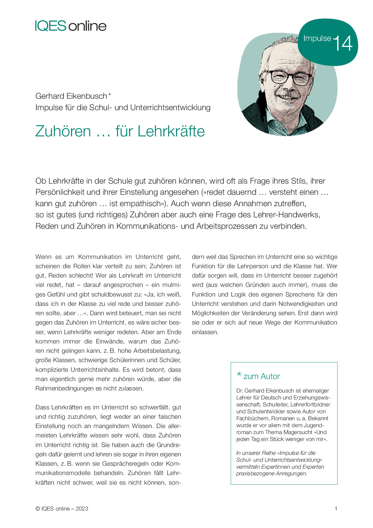 Zum Autor: Dr. Gerhard Eikenbusch ist ehemaliger Lehrer für Deutsch und Erziehungswissenschaft, Schulleiter, Lehrerfortbildner und Schulentwickler sowie Autor von Fachbüchern, Romanen u. a. Bekannt wurde er vor allem mit dem Jugendroman zum Thema Magersucht »Und jeden Tag ein Stück weniger von mir«.