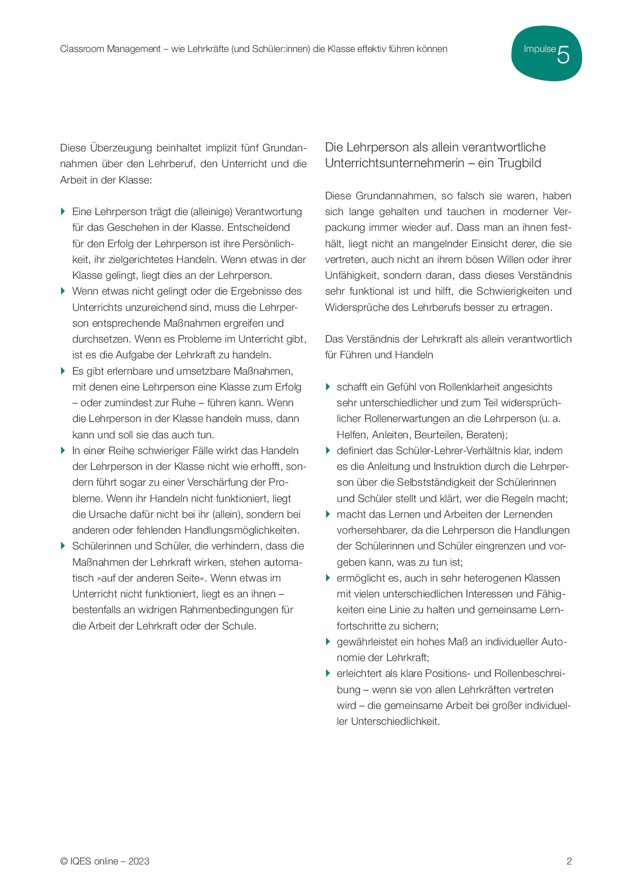 Viele Lehrkräfte meinen, Unterrichtsqualität allein herstellen zu müssen. Aber: Diese Qualität wird von Schülerinnen und Schülern, Lehrkräften und Schule gemeinsam erarbeitet. Dieses Verständnis von Professionalität entlastet erheblich von dem Druck, alles allein machen zu müssen.