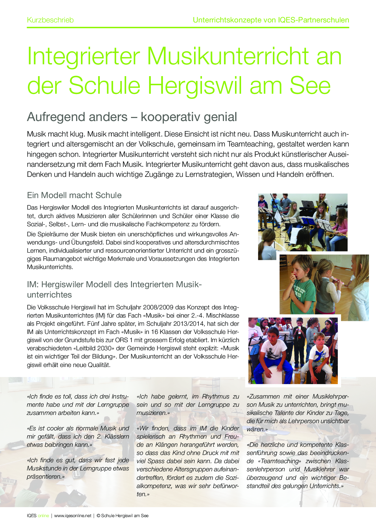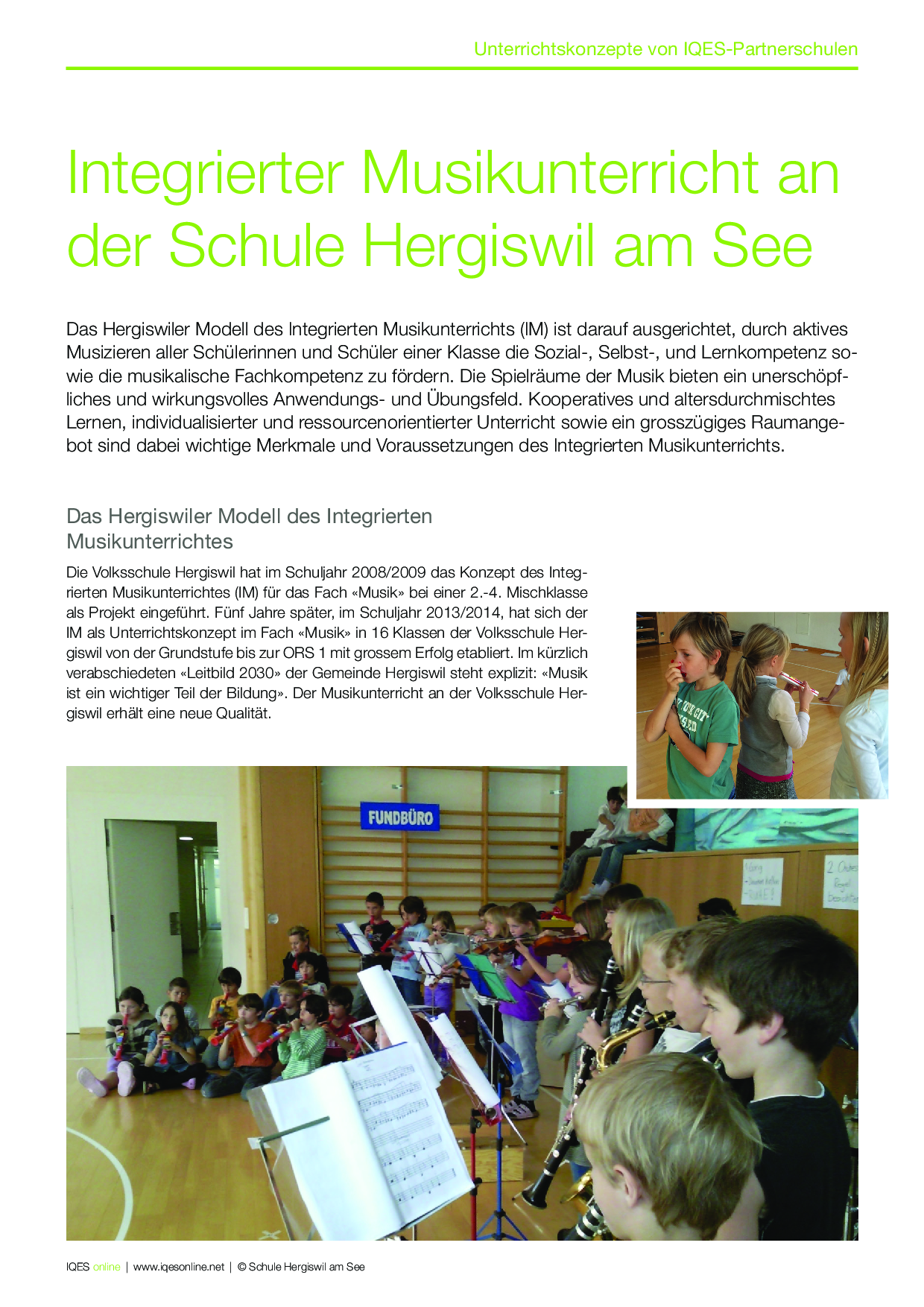Die Volksschule Hergiswil am See führte das Konzept des Integrierten Musikunterrichts (IM) für das Fach «Musik» im Schuljahr 2008/09 bei einer 2.-4. Mischklasse als Projekt ein. Fünf Jahre später, im Schuljahr 2013/14, hat sich der IM als Unterrichtskonzept in 16 Klassen der Volksschule Hergiswil von der Grundstufe bis zur ORS 1 mit grossem Erfolg etabliert. Der Musikunterricht erhielt damit eine neue Qualität. Im kürzlich verabschiedeten «Leitbild 2030» der Gemeinde Hergiswil steht explizit: «Musik ist ein wichtiger Teil der Bildung».