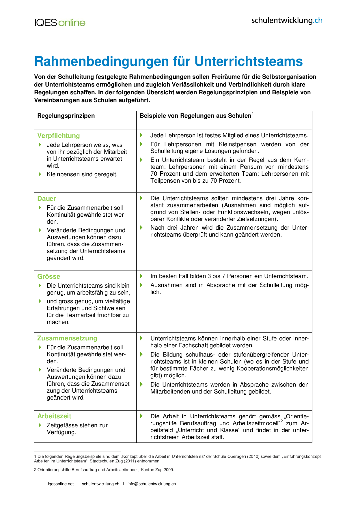 In der hier dargestellten Übersicht werden Regelungsprinzipien und Beispiele von Vereinbarungen aus Schulen aufgeführt, womit optimale Rahmenbedingungen für Unterrichtsteams festgelegt werden können.