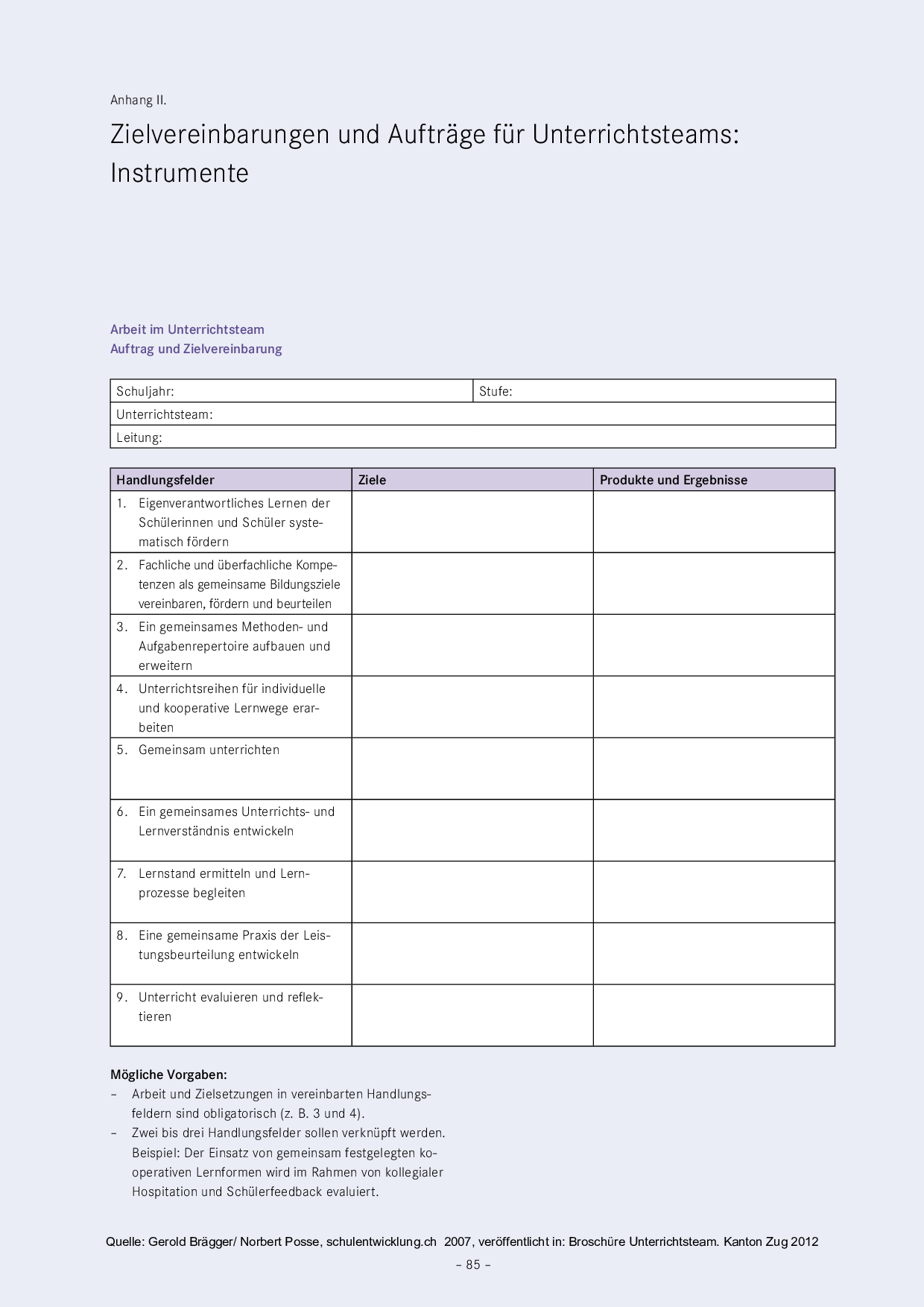 Mit den in diesem Dokument vorhandenen Formularen können Zielvereinbarungen und Aufträge im Unterrichtsteam festgelegt werden. In diesen Formularen können die Ziele, die Umsetzung sowie das Auswertungsgespräch mit der Schulleitung festgehalten werden.