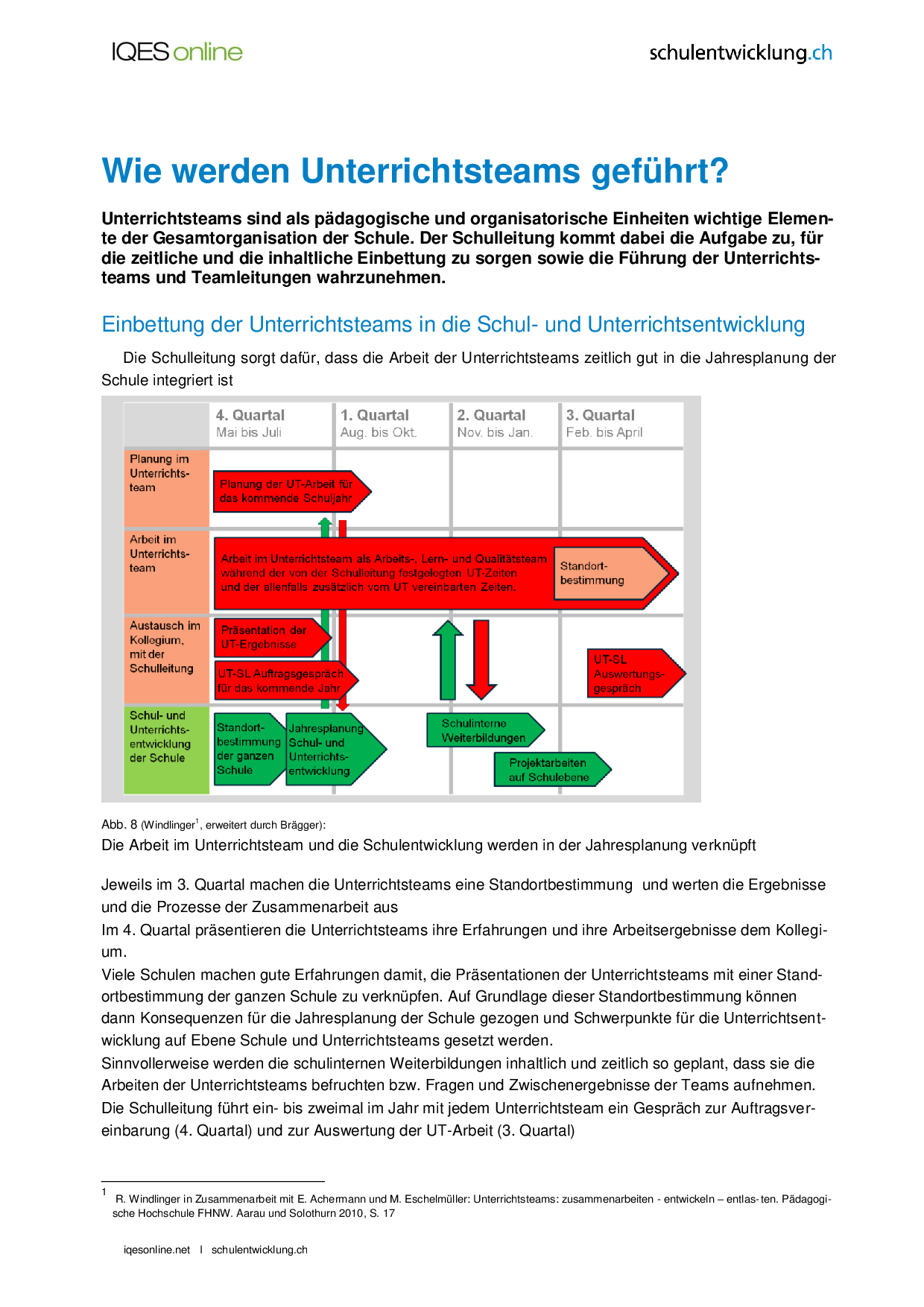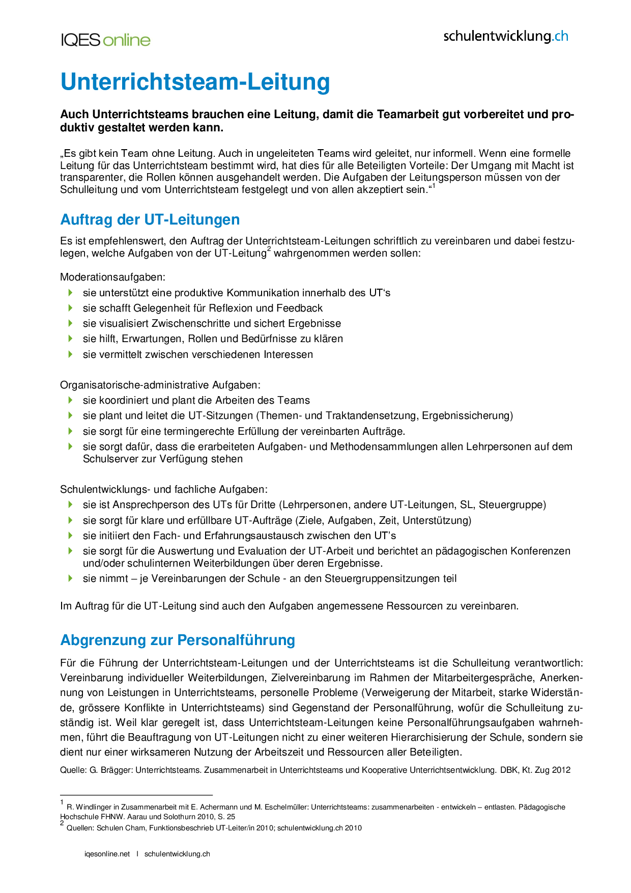 Wie werden Unterrichtsteams geführt? Unterrichtsteams sind als pädagogische und organisatorische Einheiten wichtige Elemente der Gesamtorganisation der Schule. Der Schulleitung kommt dabei die Aufgabe zu, für die zeitliche und die inhaltliche Einbettung zu sorgen sowie die Führung der Unterrichtsteams und Teamleitungen wahrzunehmen. Wie Unterrichtsteams in die Schul- und Unterrichtsentwicklung eingebettet werden sollen.