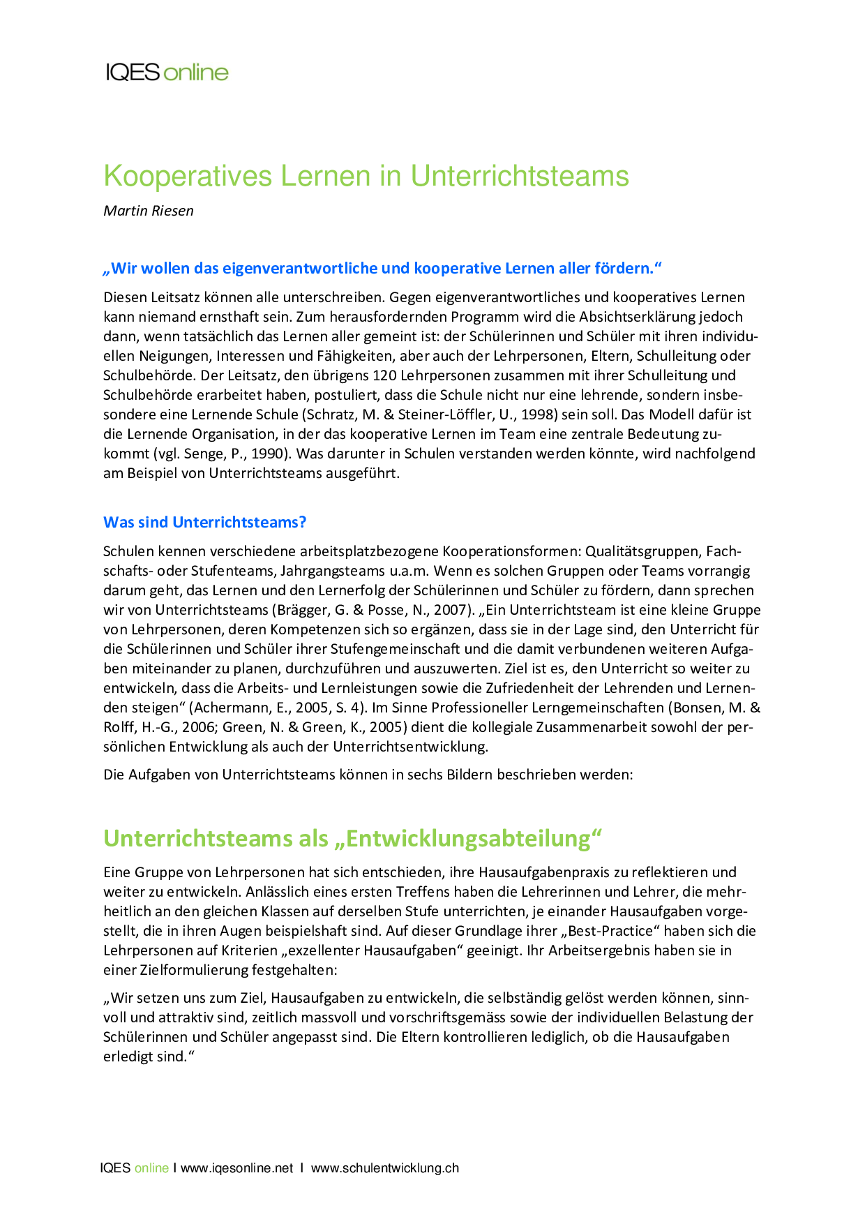 In diesem Fachartikel wird Kooperatives Lernen in Unterrichtsteams behandelt. Die Unterrichtsteams werden dabei in sechs Bildern beschrieben, welche deren Aufgaben veranschaulichen sollen.