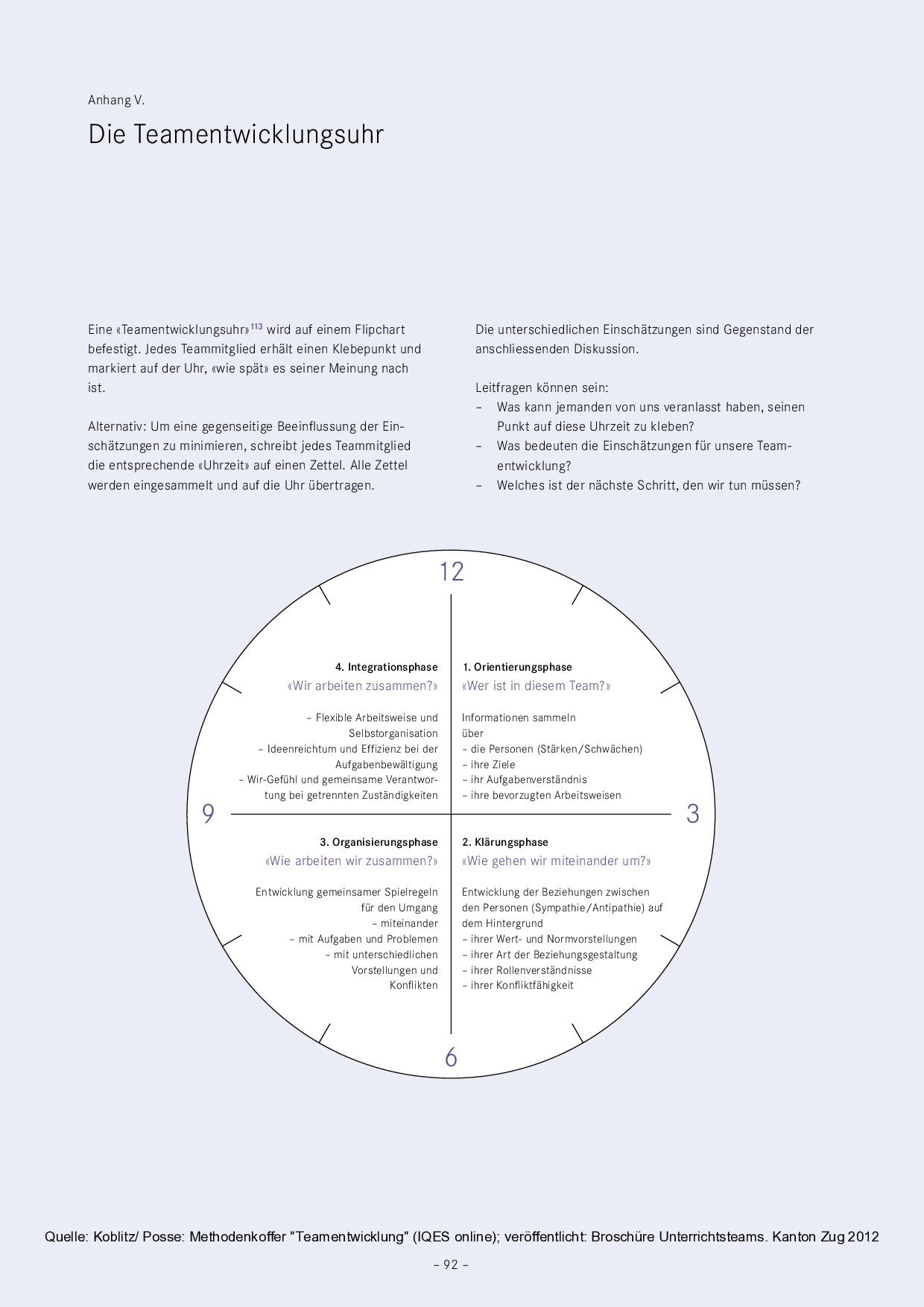 Die hier vorgestellte Teamentwicklungsuhr kann als Instrument zur Evaluation im Team dienen. Dabei kann jedes Mitglied ihre Einschätzung abgeben, wobei sich Unterschiede zeigen werden, welche zur Diskussion anregen können. Exemplarisch sind in diesem Dokument einige Leitfragen vorhanden.