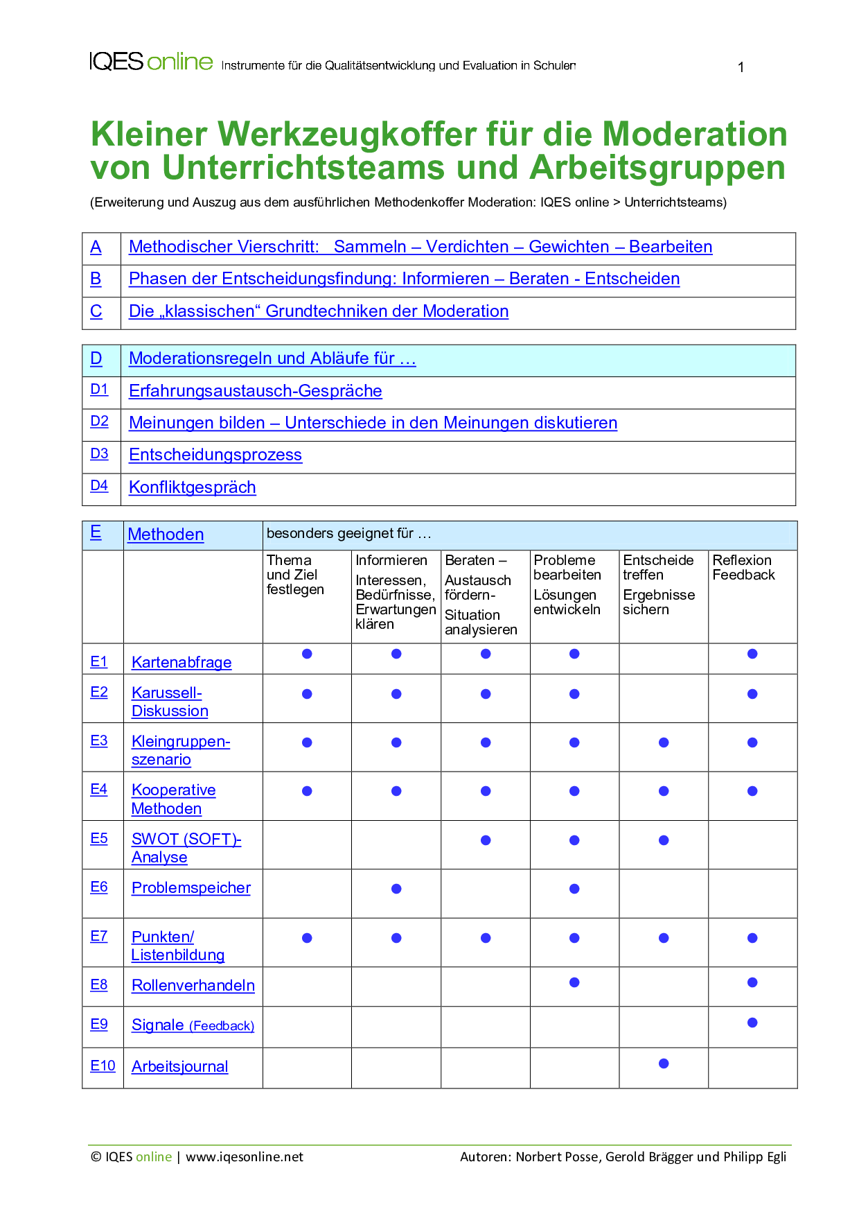 E | Methoden | Thema und Ziel festlegen | Informieren, Interessen, Bedürfnisse, Erwartungen klären | Beraten, Austausch fördern, Situation analysieren | Probleme bearbeiten, Lösungen entwickeln | Entscheide treffen, Ergebnisse sichern | Reflexion, Feedback |