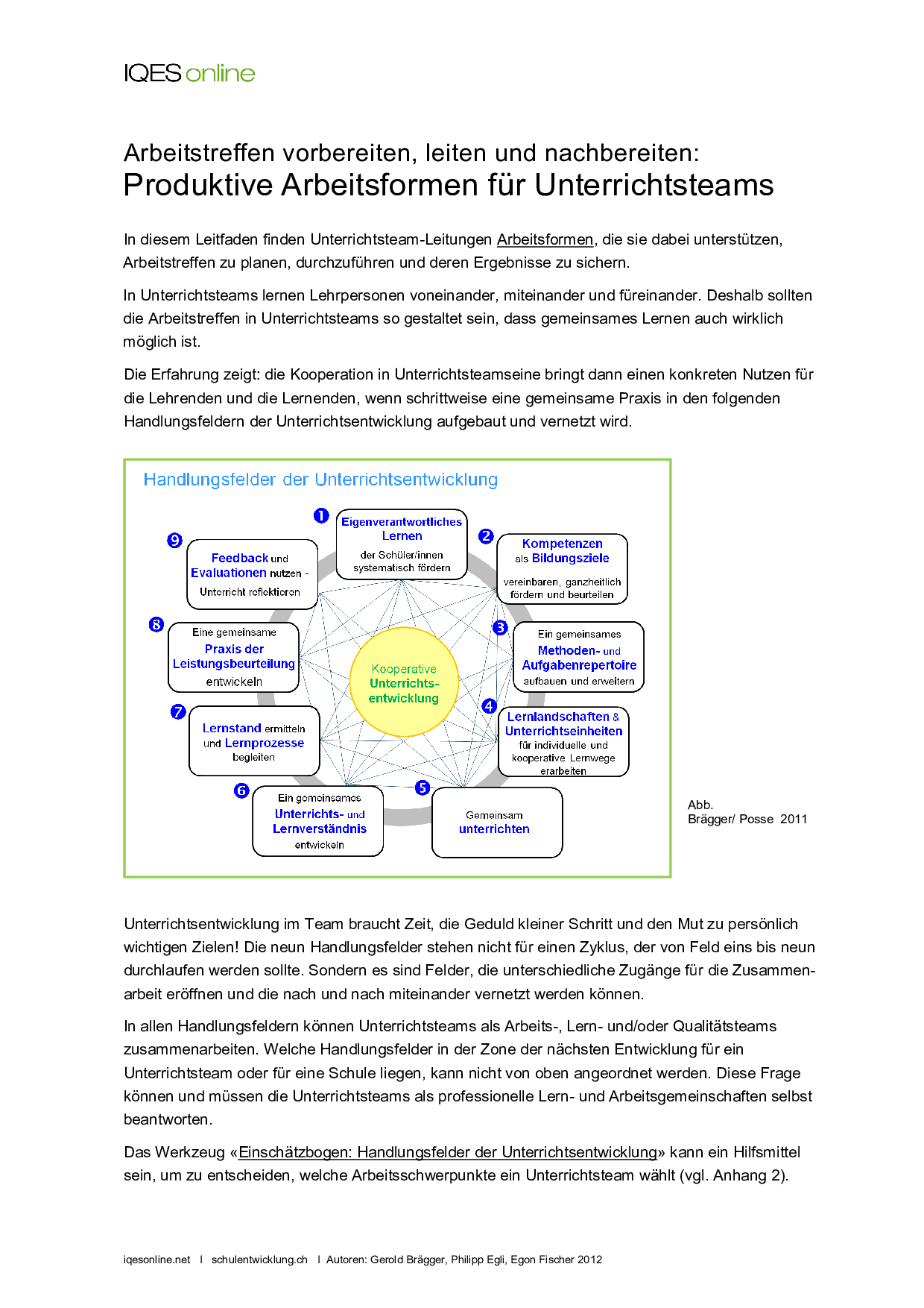 In diesem Leitfaden finden Leitungen von Unterrichtsteams verschiedene Arbeitsformen, um Arbeitstreffen zu planen, durchzuführen und deren Ergebnisse zu sichern. Arbeitstreffen in Unterrichtsteams sollten so gestaltet sein, dass gemeinsames Lernen möglich ist.